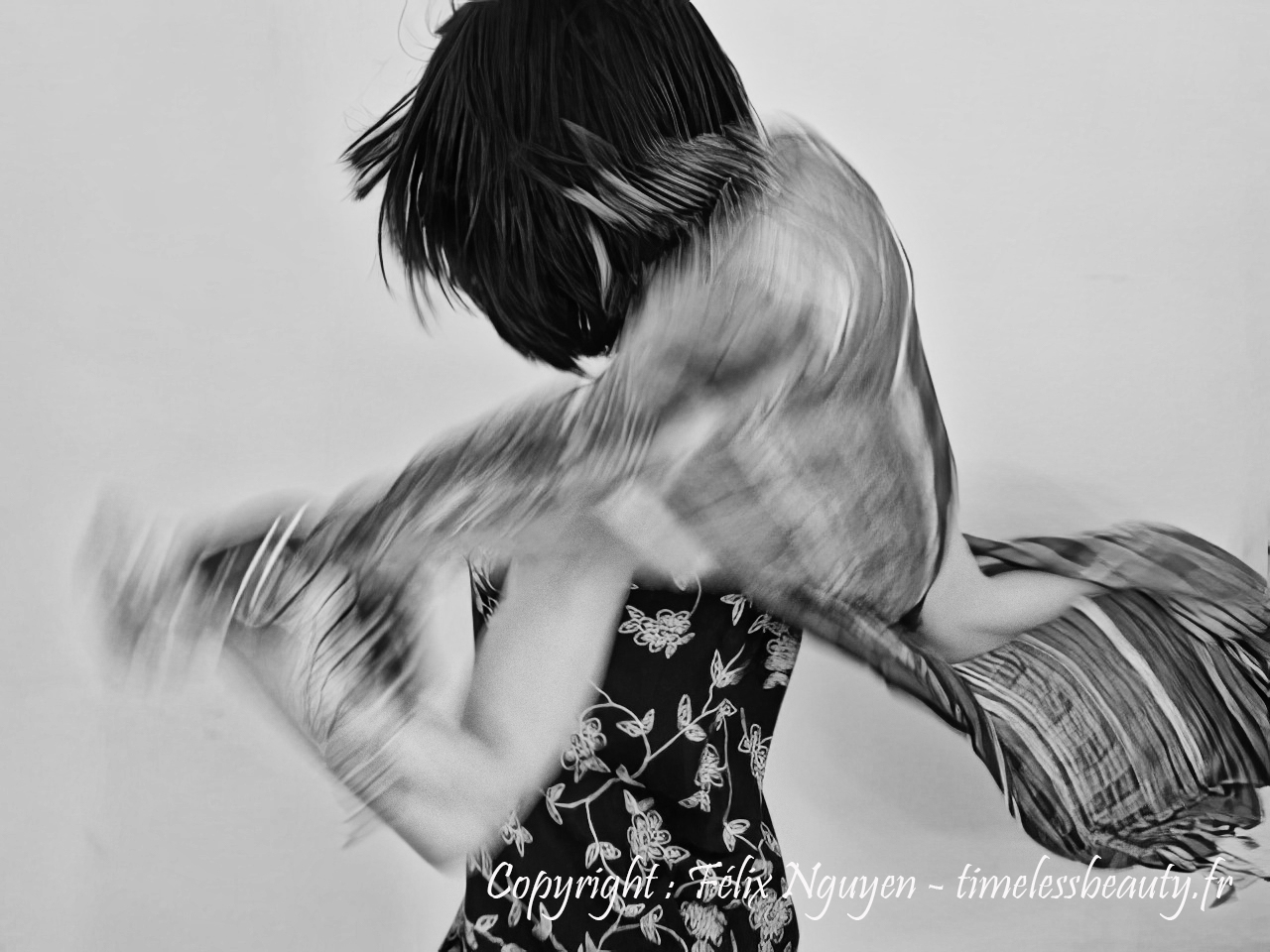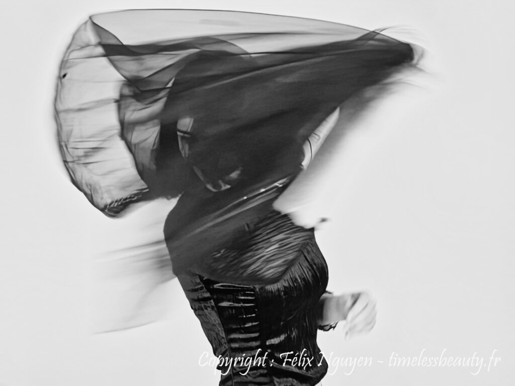 Elle protège le mystère : un visage à peine deviné devient plus universel qu’un portrait exact, un mouvement imprécis raconte mieux la vie qu’un arrêt parfait. Les sujets sont au corps à corps avec leurs émotions, à l’image des voiles qui les submergent et fusionnent avec eux. Les formes sont toutes liées et indéfinissables. C’est l’enchaînement esthétique d’états puissants et vifs dépassant le rationnel pour s’approcher du réel et de l’intensité de la vie.