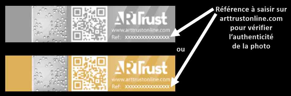 – Si vous ne disposez pas d’un smartphone ou d’une application de lecture de QR Code ; il vous suffira d’aller sur la page d’accueil du site https://arttrustonline.com et de saisir la référence du scellé argenté (collé au dos du tirage) ou du scellé doré (collé sur le certificat d’authenticité) dans la zone dédiée à l’authentification sur la page d’accueil.