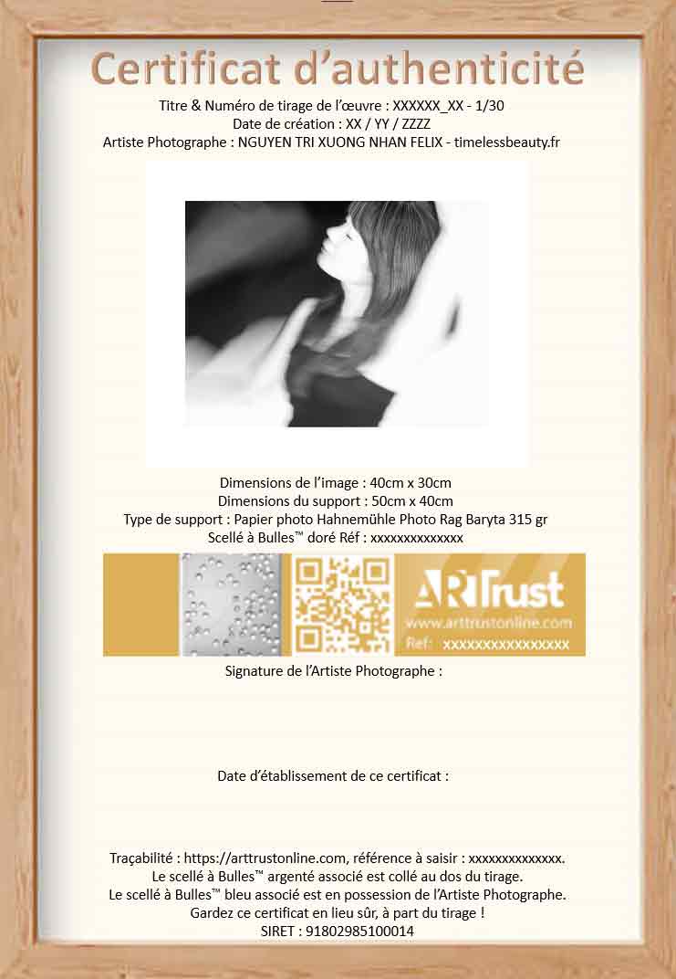 Ce document permet d’avoir une preuve physique et sécurisée du certificat d’authenticité du tirage de façon indépendante d’ARTtrust.com.